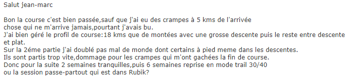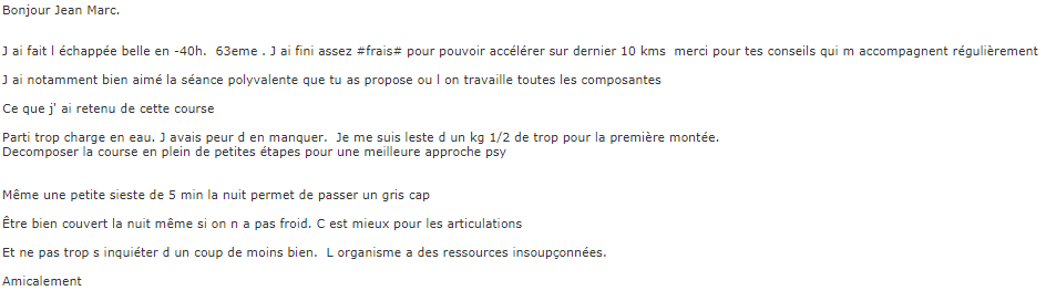 Grâce aux nouvelles technologies, il est maintenant possible de proposer un PROGRAMME TRAIL de QUALITÉ même à distance. Appréhender les mécanismes de l’entraînement trail aujourd’hui, c’est déjà être en retard sur ceux ou celles qui se sont lancé 3 mois ou 6 mois auparavant. Mais c’est prendre de l’avance sur tout ceux qui se lanceront demain. Ou qui ne franchiront jamais les portes… C’est donc le moment ou jamais. Et je te rappelle que seulement quelques privilégié(e)s peuvent y accéder CHAQUE ANNÉE…